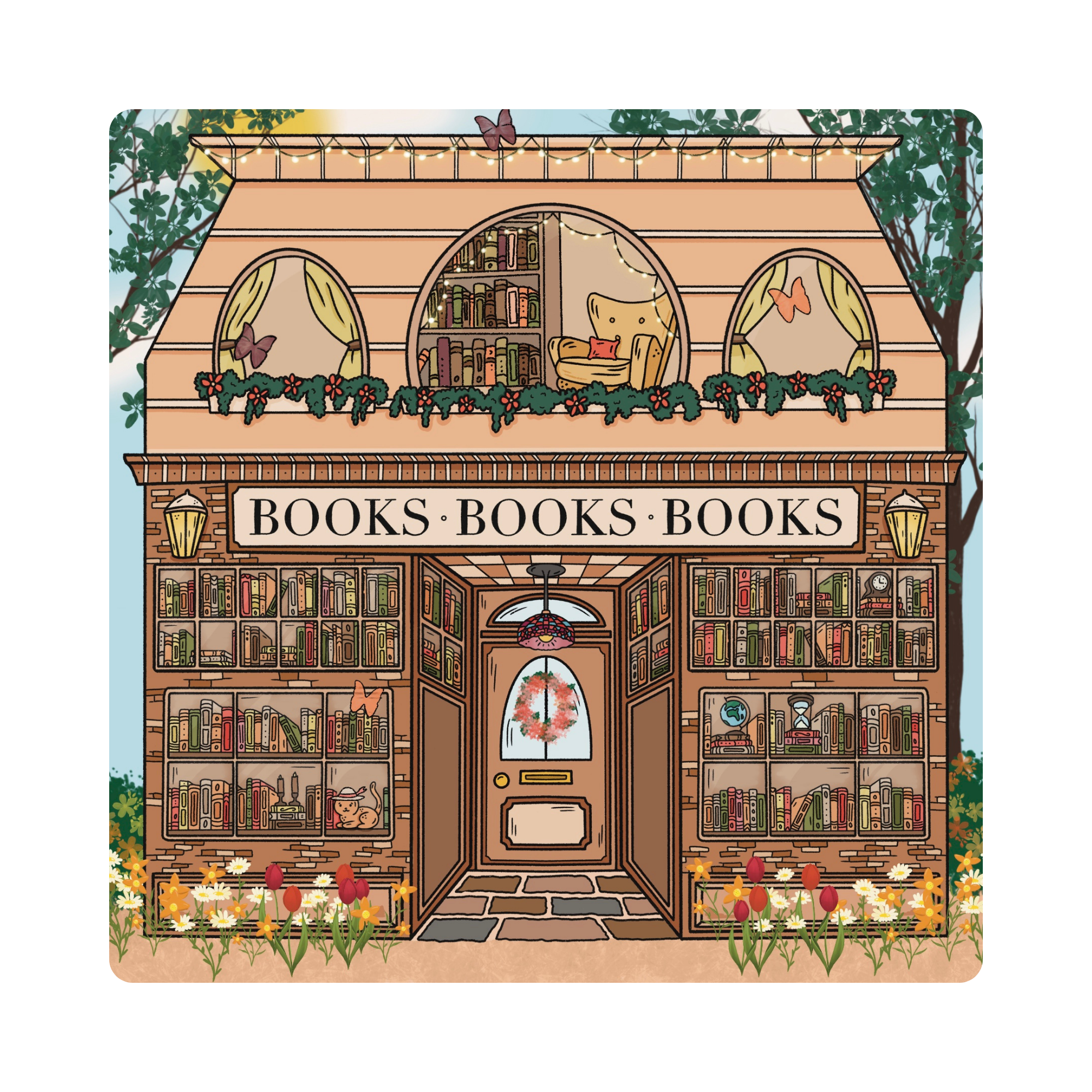 Spring bookish coaster with a bookstore front and sunny vibes 🌻